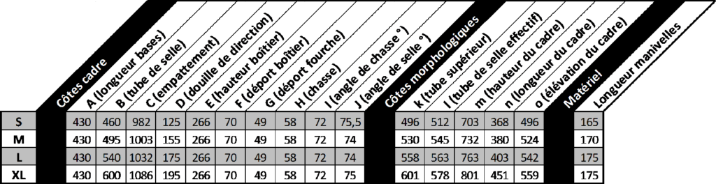 – Tailles –Nous proposons 4 tailles allant du S au XL (voir tableau de cotation) – Poids –Le cadre nu pèse entre 2kg et 2,5kg (en fonction de la taille). Un vélo – Avantages –– Un cadre beaucoup plus résistant que de nombreux vélos en carbone |