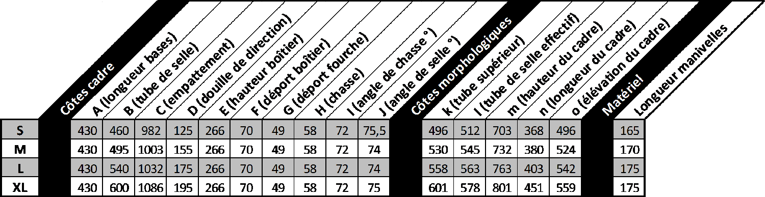 – Tailles –Nous proposons 4 tailles allant du S au XL (voir tableau de cotation) – Poids –Le cadre nu pèse entre 2kg et 2,5kg (en fonction de la taille). Un vélo – Avantages –– Un cadre beaucoup plus résistant que de nombreux vélos en carbone |