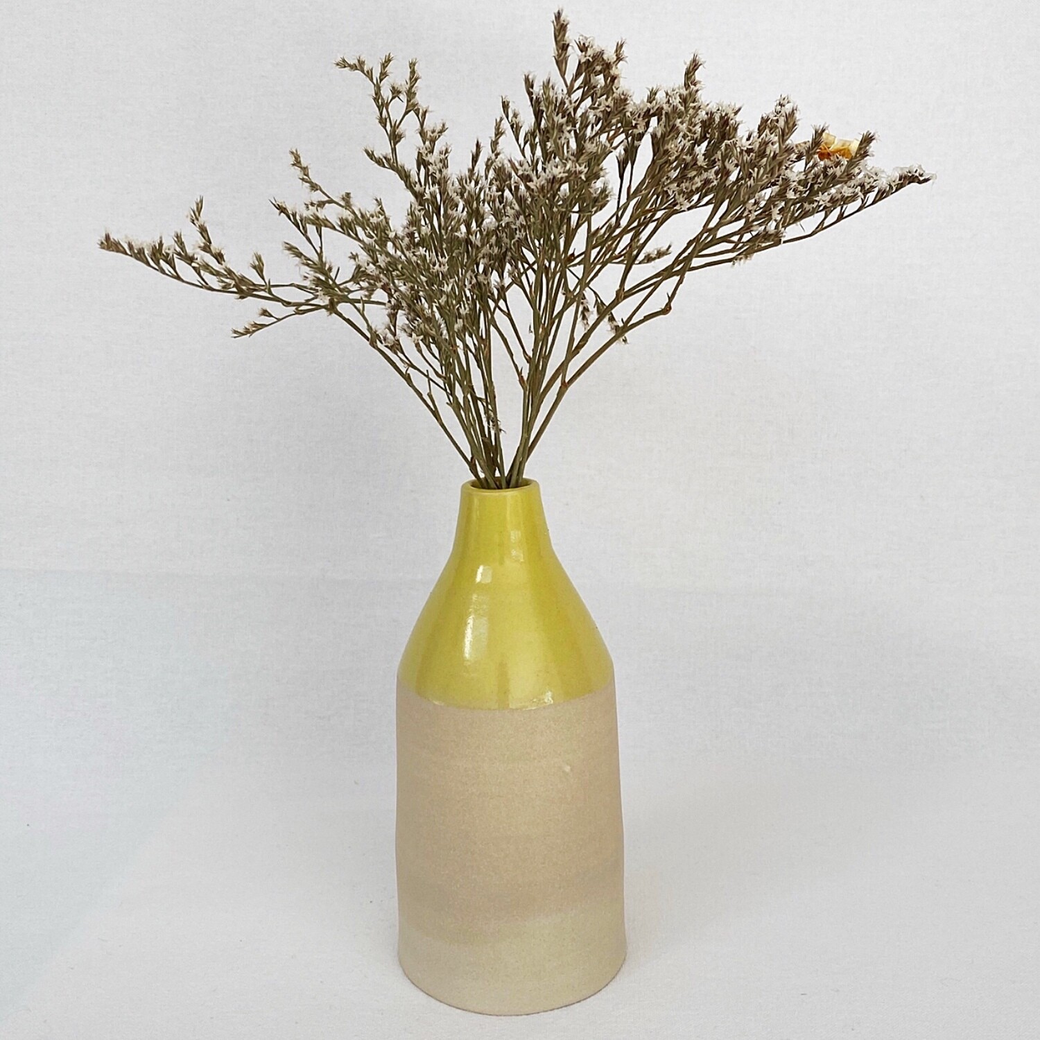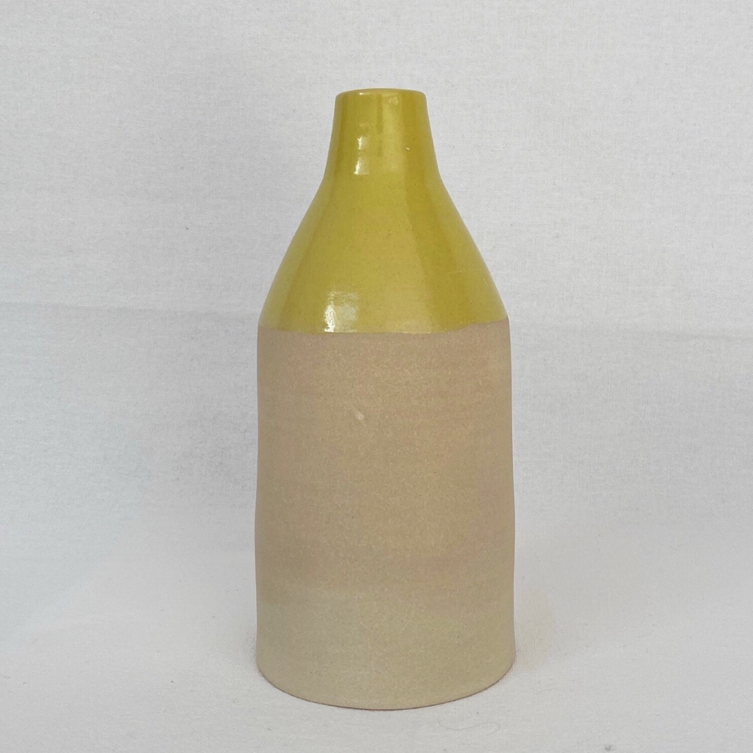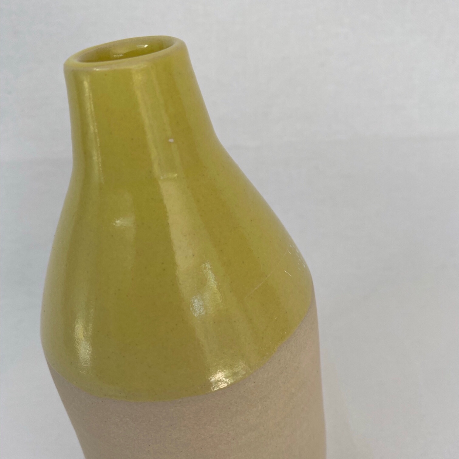 La partie haute du vase est de couleur jaune et la partie basse est laissée brute.